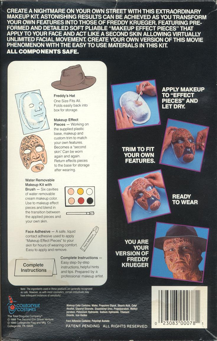 My senior year at Mater Dei, they finally allowed wearing costumes on Halloween. I spotted the above-pictured Freddy Krueger makeup kit at a costume shop, and since Freddy was enjoying the height of his popularity and I could do a good Freddy voice (my favorite line to pull out was "How sweet — fresh meat!"), it seemed perfect.