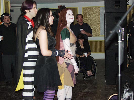 But as much as I tried to work the crowd, I only managed to get second place in the contest. The winner was the girl who's cut off on the left side of that shot, but who went as Sally, the patchwork doll from "The Nightmare Before Christmas" — she can be seen more clearly in this shot. I was a tad bit bitter, since though I think her costume was wonderful, she wore the same exact thing at the previous year's Dead Man's Party show, winning first place that year too, as I recall. Now, granted, I've worn the same costume more than once before, specifically my Pencil-Neck Geek costume, but never twice in the same venue or for an overlapping audience. Oh well, enough of my little "superior dance".