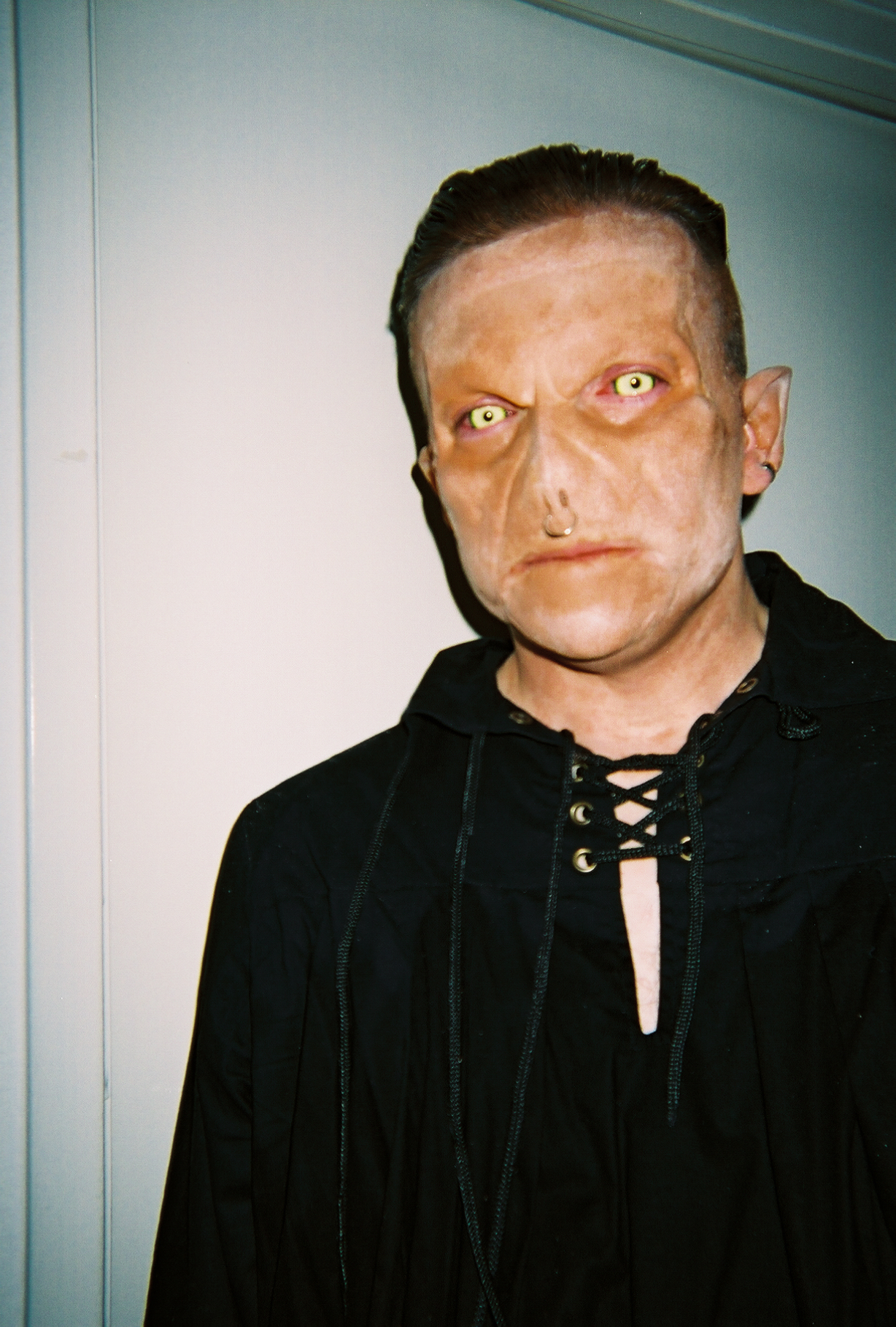 The Skin Illustrator paints did indeed turn out to be quite easy to work with, although they're a bit drying to the skin due to all the alcohol you have to use to activate them. I mostly applied the makeup with a black plastic stipple sponge, and there was a bit of a tendency for a mottled look to be produced (which may have just been my technique), but this didn't bother me at all in this case since that look works great for unclean Orc skin. For some reason I had some trouble applying color at the top edge of the prosthetic to help hide it (maybe due to spirit gum residue there??), although the camera's flash is making it look worse than it did in person in the below shot (the daylight shots are a better representation of how it looked).