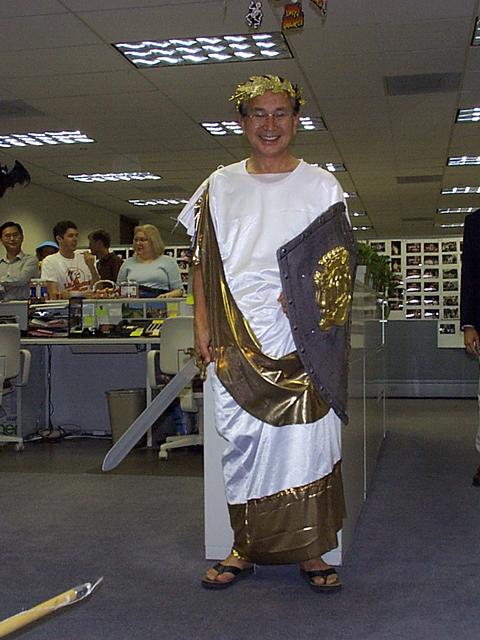 Koichi as a rather action-oriented Caesar, plus a glimpse of some Halloween-spirit-challenged employees in the background.