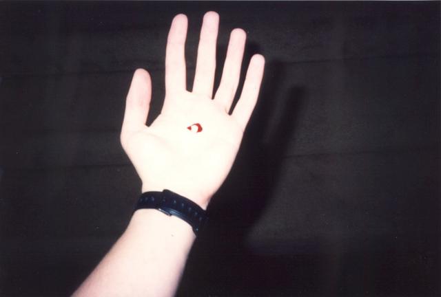Zoom Out The flash on my camera washed it out, so it's a bit hard to tell that that's supposed to be a tooth I've knocked out (complete with fake blood). I believe I used a real baby tooth for that. Zoom In