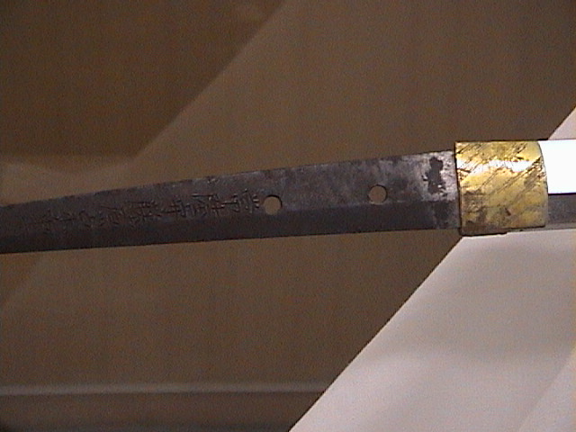| A close-up of the inscription on the part of the blade that goes inside the handle. Too many characters to just be the sword-maker's signature, so not sure what-all's written there... | ||||