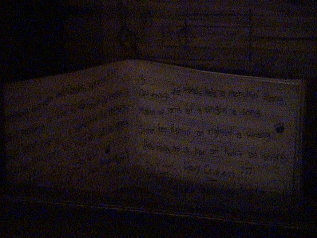 There's some neat theming inside Tokyo Disneyland's Country Bear Theater which I believe may be unique to this incarnation of it, and I tried to get some photos of it, but unfortunately I either didn't have my flash with me (since this was my last half-day before heading home and I hadn't had any reason to use the flash on my previous days at the parks) or I just didn't have time to whip it out before the show — I forget which. I was able to enhance this photo and a couple of the others by a small amount in Paint Shop Pro, but there's so much CCD noise that it's impossible to improve the general look much without hurting legibility of the text. In any case, the display cases contain old memorabilia, such as the sheet music for Country Bear Band hits. I think this is a description of "The Ballad of Davy Crockett" from the bears' point-of-view. |
