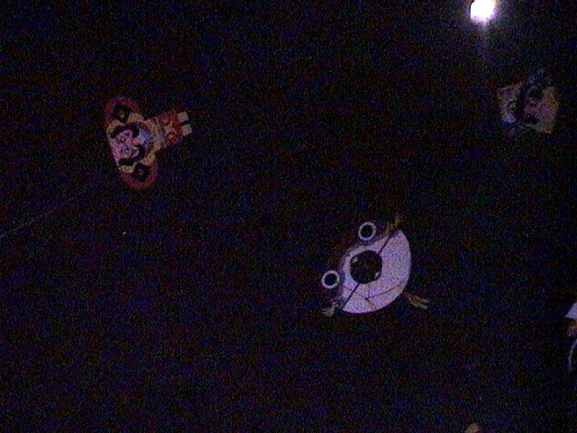 Zoom Out Japanese kites "flying" overhead. I had to up the brightness of this shot in Paint Shop Pro, as the original was quite dim. Unfortunately the DCR-PC5's slow-shutter mode isn't available for still photos (and the Night Shot mode renders things essentially in black & white).
