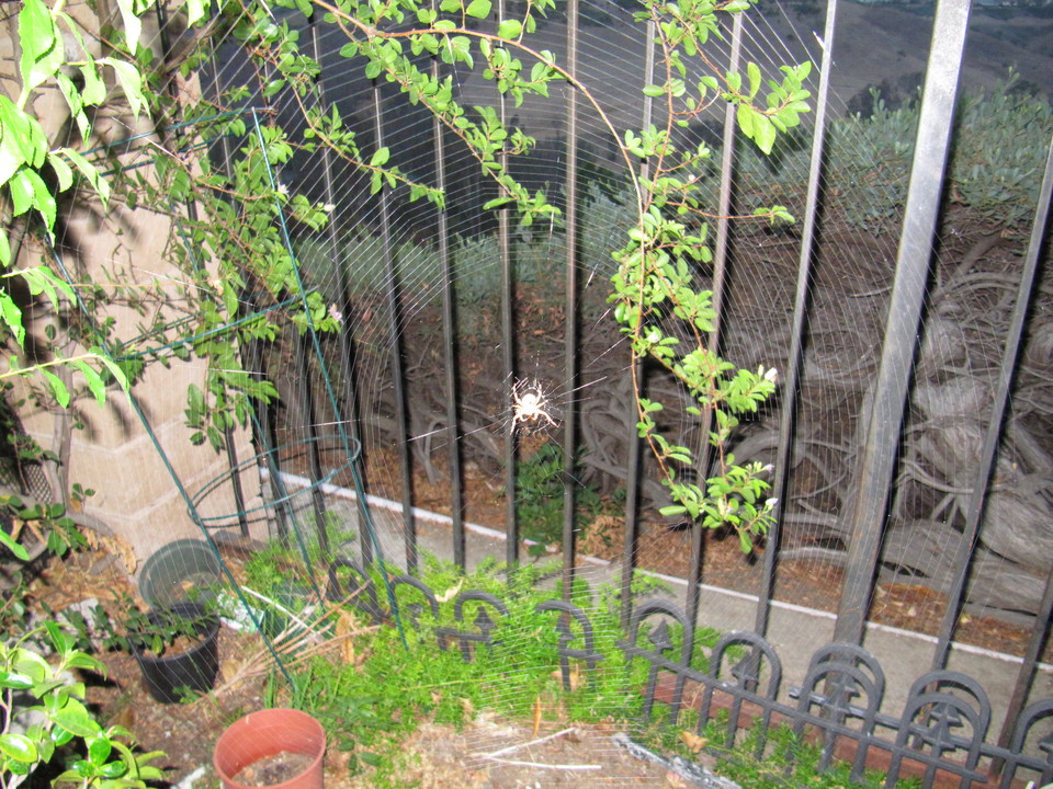 Flash photo which washes out the spider, but lets you see the web better. It's interesting how the spider has currently left a big gap between the outer orb-weaving and the orb-weaving at the center of the web.
