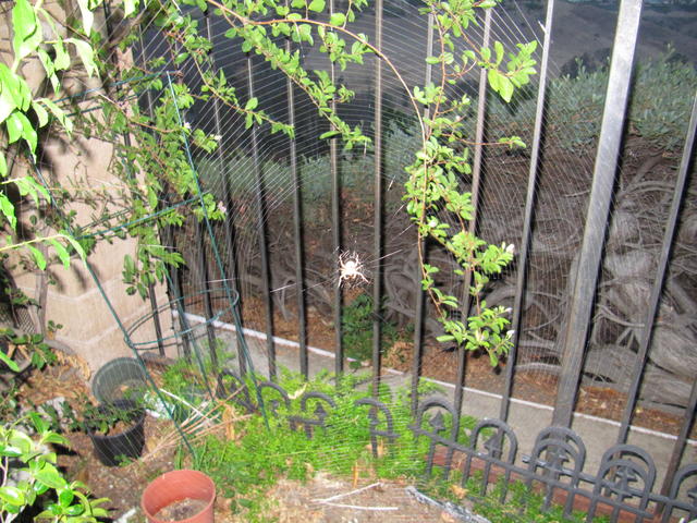 Zoom Out Flash photo which washes out the spider, but lets you see the web better. It's interesting how the spider has currently left a big gap between the outer orb-weaving and the orb-weaving at the center of the web. Zoom In
