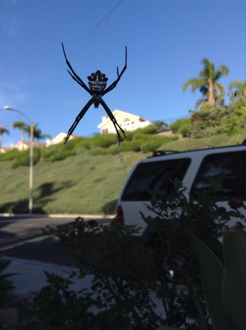 Zoom Out Invasion of the Giant Argiopes. Coming soon to a theater near you. Gotta love the crazy "horns" these ladies have on the back of their abdomens. Also, it's interesting — given these spiders' coloration, I'd never really understood where the "argentata" / "silver" appelation came from, but in this particular dorsal-view (top side) shot, the spider's body looks super-silvery! Hmmm. Zoom In