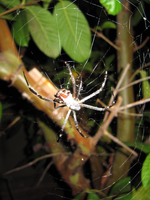 Zoom Out Tonight there was a female Argiope argentata at head level at the close edge of our guava tree for the first time, allowing me to get some closer looks than I ever had before, and these dorsal shots. Unfortunately the only photo of the ones I took with my Mom's Canon PowerShot that wasn't blurry due to the slow shutter speed (I guess I should really pull out my tripod next time I do night shots) was this flash one, in which much of the spider is washed out past the point of being able to fix it in a photo editor. However, there's some detail in this photo that you can't see in the lower-resolution iPod Touch shot. Zoom In