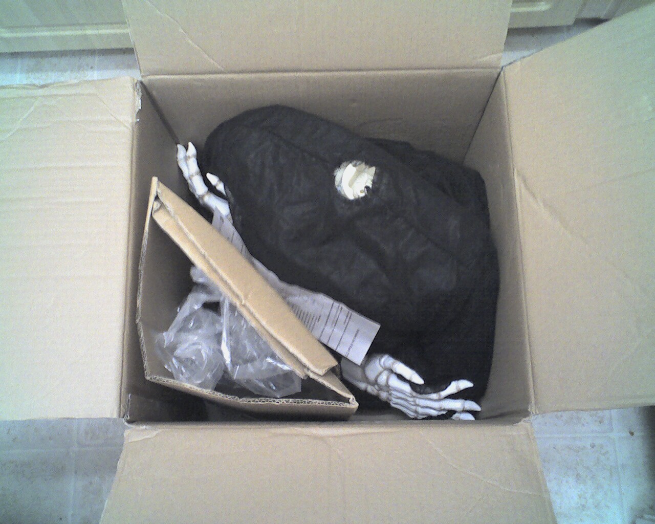 But back to the creatures. The big guy is a 6 Foot Spooky Skeleton from Gemmy. I don't see him in their Halloween section, and a search on their site for "skeleton" gives "Your search returned 2 product(s) out of 666 searched", but no Mr. 6 Foot, so it would seem they're not making him anymore. Here's the label on his box: