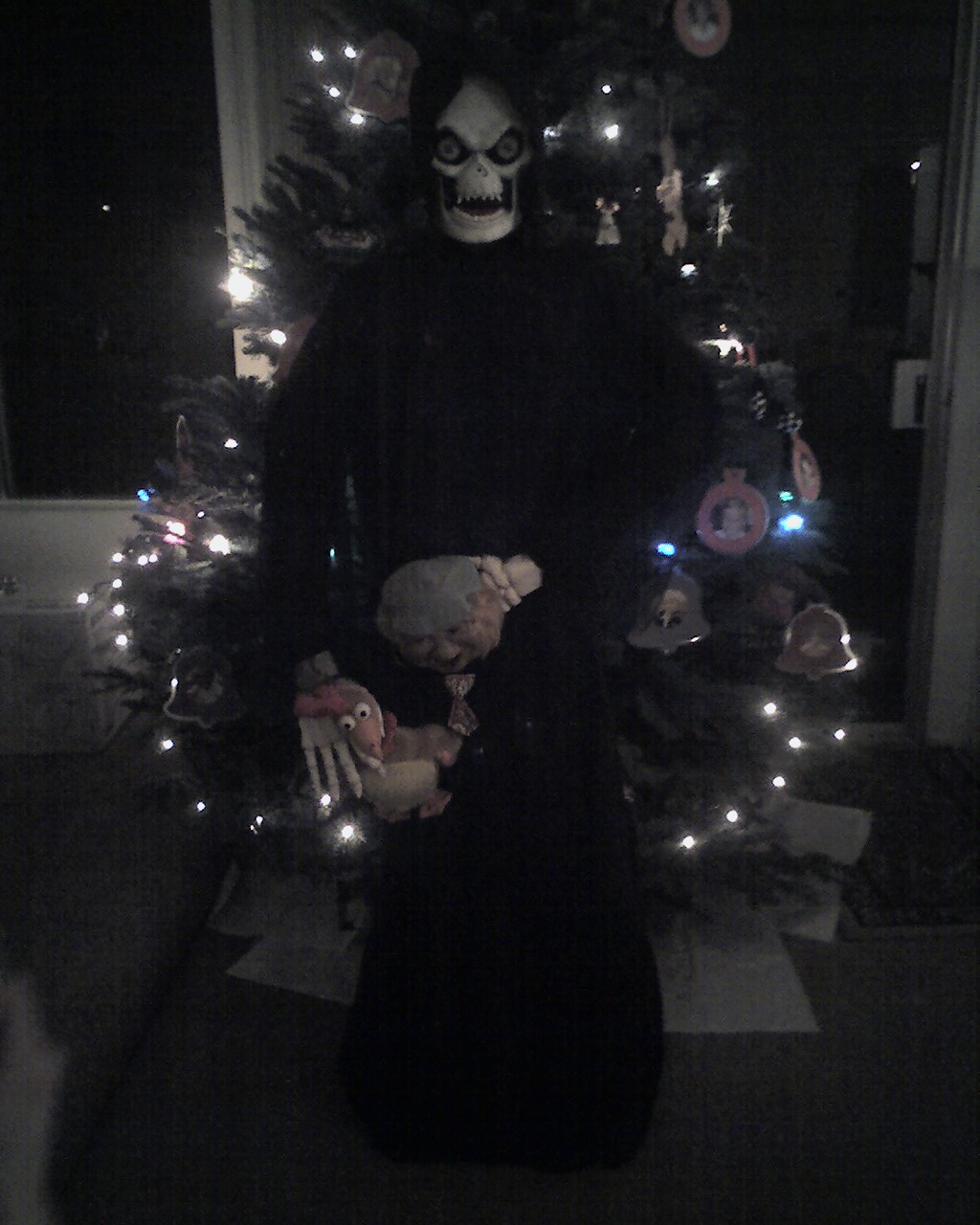By coincidence, this Christmas, three of my family members gave each other electronic noise-making creatures. My Mom gave Patrick a Crazy Cluck The Wacky Chicken, Patrick gave me a 6 Foot Spooky Skeleton, and Patrick gave Steve a Laffun Head. More on each of these in a moment, but here's a video of them frolicking together in front of the Christmas tree: