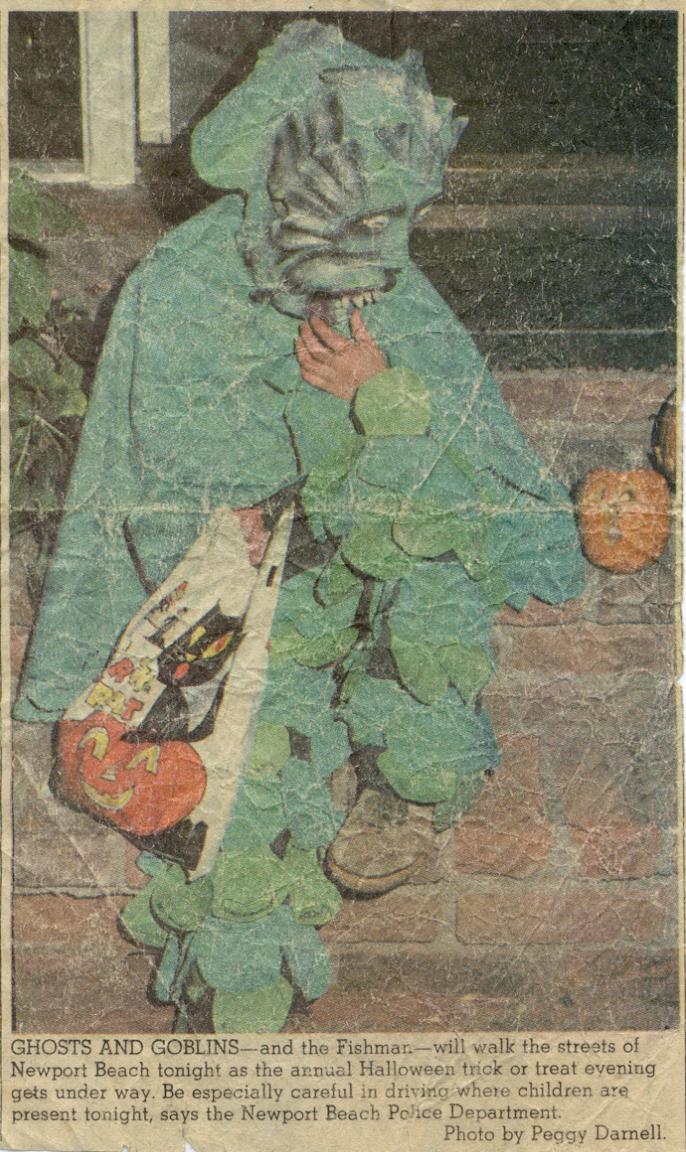 As I recall, photographer Peggy Darnell made this costume for one of her children on a previous Halloween and loaned it to us for me to use in 1978. This (rather rumpled) photo actually appeared in the October 31, 1979 edition of the Newport Ensign, according to my Mom's notation on the back. So their claim that "the Fishman" (Peggy's name for the costume, I guess — I called myself a "Sea Monster") would be walking the streets in Halloween 1979 appears to have been false. Not sure if the photo was taken a year prior to this issue, or if Peggy had me dress up in the costume again for a photo shoot a few days prior to Halloween '79.