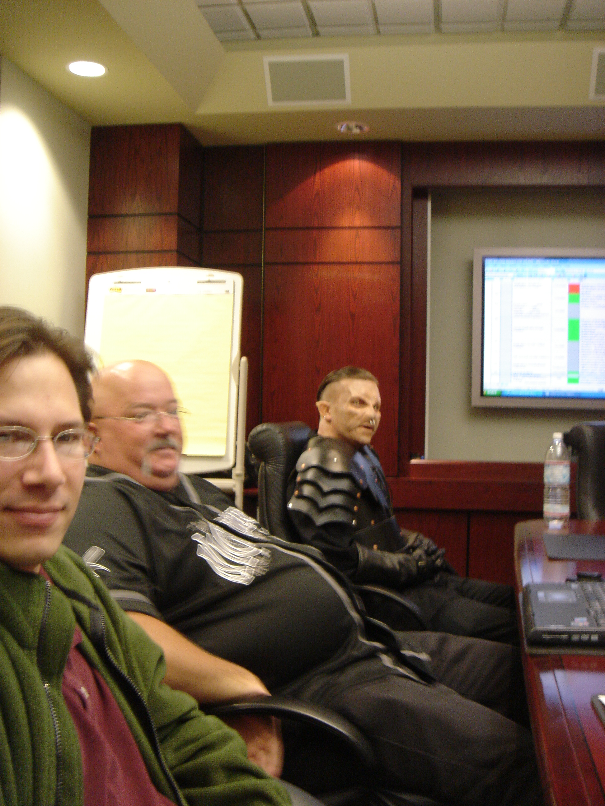 It was surprising how consistently good (if a little samey) most of the photos turned out, despite the haste with which my Mom and I took them, and the anguish my costume was inflicting upon me while I was doing my modeling. Also good is the out-of-focus but entertainingly demonic-looking photo of me marauding in the conference room taken by my coworker Ryan. Here are the rest of the photos.