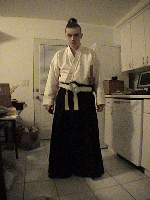 As is explained further on my Halloween 1996 Costume: Samurai page, I didn't have access to the photos of my Samurai costume from 1996, but I did have photos of my largely similar Samurai Killed By A Ninja costume from 2001, so I did a quick 'n' dirty photo editing job to recreate a photo of the plain-Jane Samurai costume. A little crude — it doesn't really look photorealistic — but the painting-esque look is actually kind of nice, I think. Here's the original photo, with the edited version lined up next to it for comparison:
